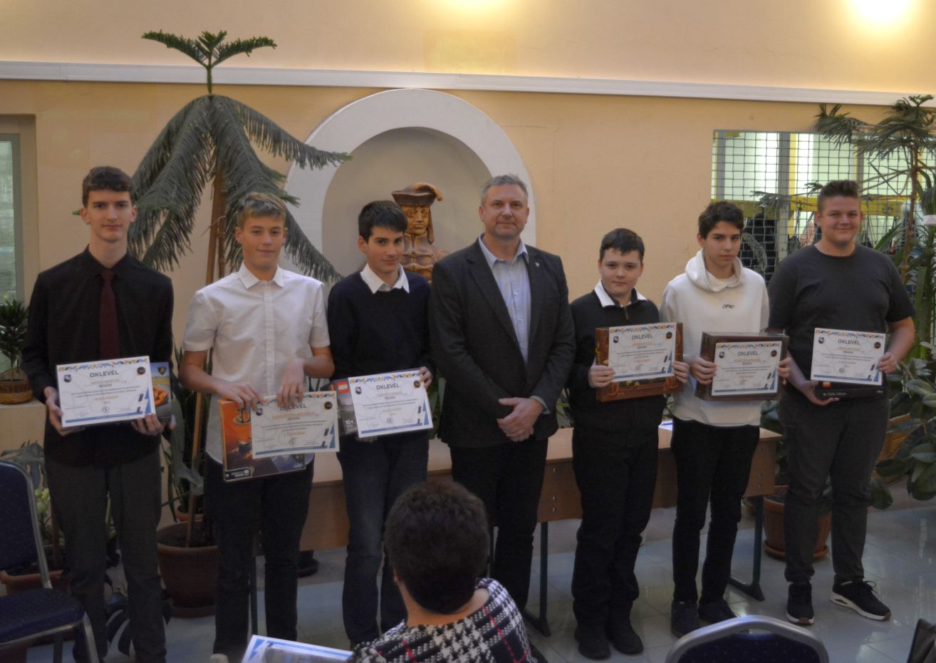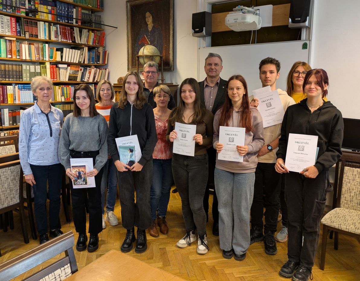 versenyeken sikeresen szerepelt tanulók jutalmazása 2025. november 27-én került sor a 2024-25-ös tanévben, az AJTP országos tanulmányi versenyeken sikeresen szerepelt tanulók jutalmazására. A Zrínyi Miklós Gimnáziumért Alapítvány támogatásával megvalósult rendezvényen a díjazott tanulók és felkészítőik vettek részt. Köszöntőjében Schneider János igazgató úr méltatta a diákok eredményeit, és örömét fejezte ki, hogy az „Aranyosok”, kis létszámuk ellenére is mindig ott vannak a versenyek élmezőnyében. Megköszönte a kollégák felkészítő tevékenységét és további eredményes munkát kívánt nekik. A díjazott tanulók:matematika 1. helyezés Nemzetközi Magyar Matematika Verseny dicséret történelem csapatverseny 6. helyezés Kanta Leila 10.D: informatika csapat 1. helyezés legjobb táblázatkezelő Tóth Krisztián Axel 12.C idegennyelvi verseny – német 3. helyezés Torma Zétény Béla 10.D informatika csapat 1. helyezés Sáfár Liliána 10.D irodalmi verseny 5. helyezett történelem csapatverseny 6. helyezés Elmont Bíborka 10.D történelem csapatverseny 6. helyezés Horváth Annamária 12.C idegennyelvi verseny – német 5. helyezés (Felkészítő tanáraik: Ipcsics Csilla, Horváth Eszter, Hajduné Szabó Ágnes, Németh Szilvia, Rónaky Attila Ferenc.)