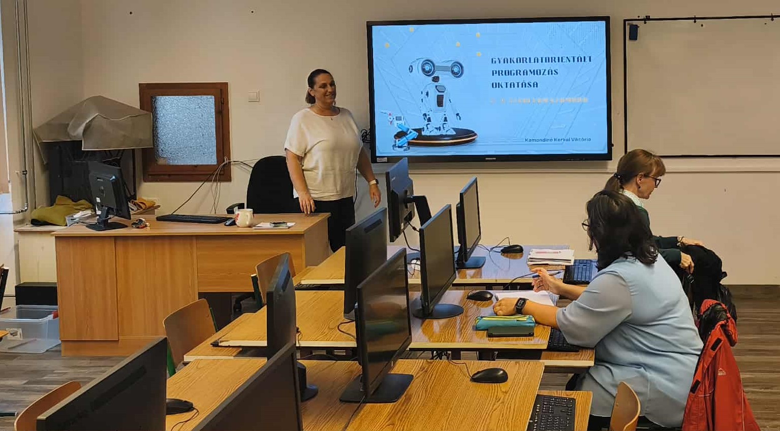 Kamondiné Kerkai Viktória tanárnő, iskolánk robotika műhelyfoglalkozásának vezetője Gyakorlatias programozás oktatása az 5─9. évfolyamos tanulók számára címmel tartott előadást szerdán érdeklődő pedagógusoknak.