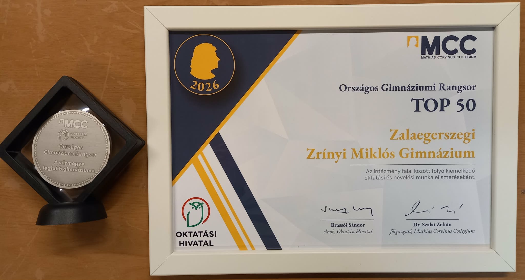A Belügyminisztérium, a Mathias Corvinus Collegium és az Oktatási Hivatal a legkiválóbb hazai gimnáziumok magas minőségű szakmai munkáját ünnepélyes gálaműsor keretében köszönte meg Budapesten, január 15-én. Szalai Zoltán, az MCC főigazgatója és Brassói Sándor, az Oktatási Hivatal elnöke nyújtotta át a Várkert Bazárban az Országos Gimnáziumi Rangsor 2026 díjait. Zala vármegye legjobbja a Zalaegerszegi Zrínyi Miklós Gimnázium lett. A Keszthelyi Vajda János Gimnázium a 60. helyen végzett a TOP 100-ban.