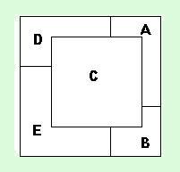 9. Egy 6 cm oldalhosszúságú négyzetet5 darab, 4 cm oldalhosszúságú négyzettel fedtük le,melyeket A, B, C, D és E betűkkel jelöltünk.Milyen sorrendben rakhattuk le a négyzeteket? |