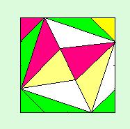 Az ábrán látható négyzet alakú területet oldalait negyedelve,és a belső négyzet átlóját harmadolva részekre osztottuk.A kapott területrészekre fehér nárciszot, sárga tulipánt, piros tulipánt,illetve zöld gyepet telepítettünk.Melyik foglalja el a legnagyobb területet? |