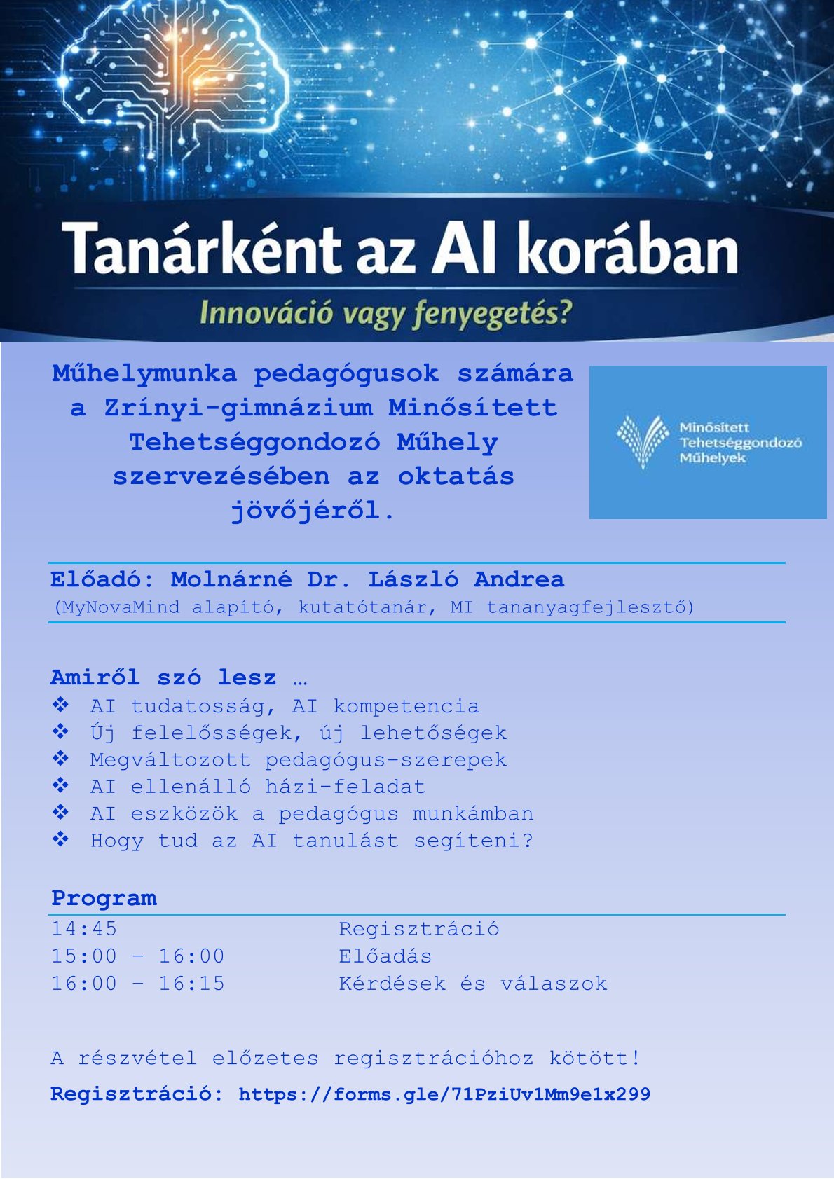 Előadó: Pálovicsné Tusnády Katalin matematika–fizika–informatika szakos pedagógus, a matematika─informatika mk. vezetője