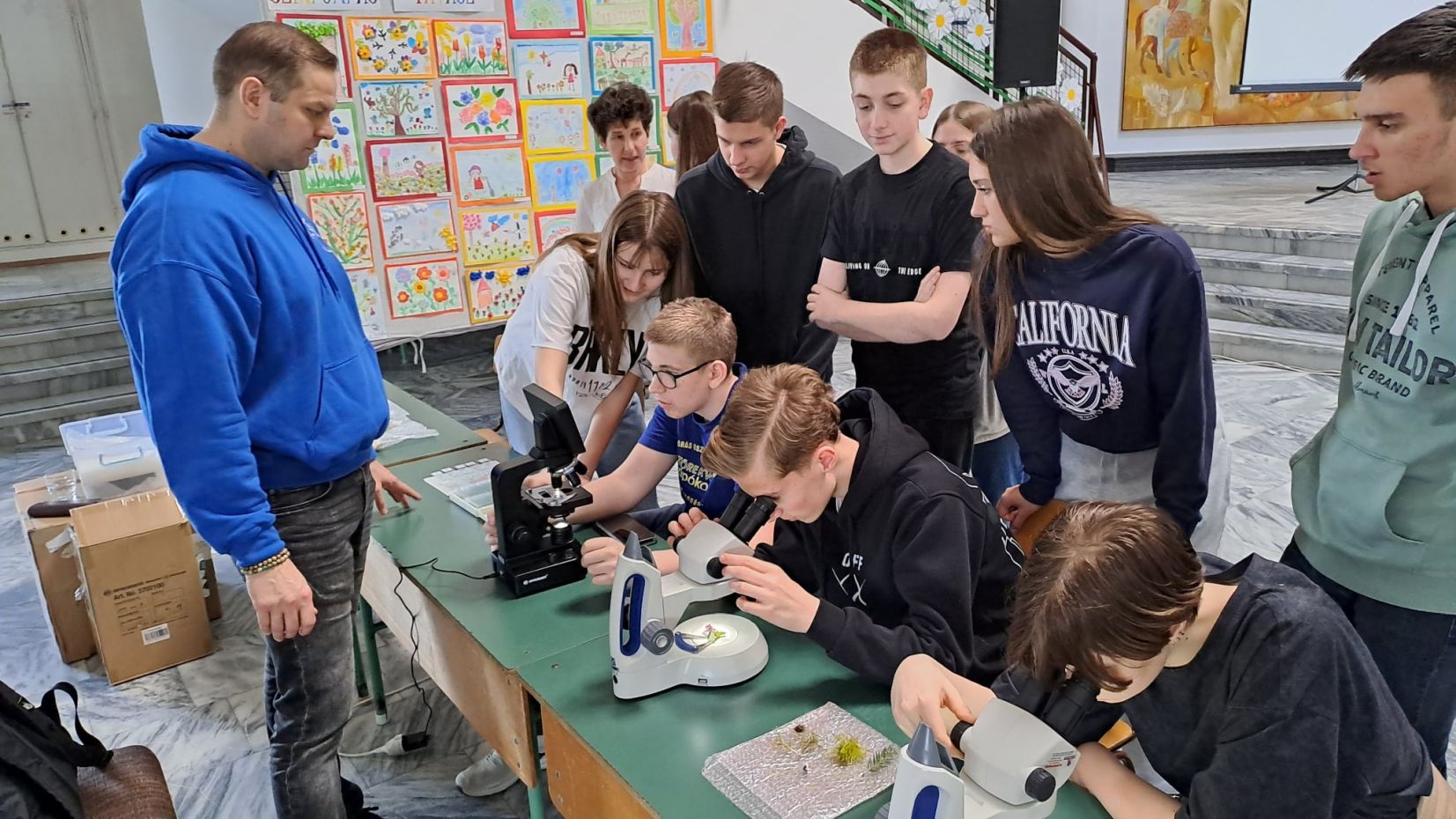 A felvételizőket az iskola főbejáratánál kollégáink és diákjaink várják, majd a terembe kísérik őket.