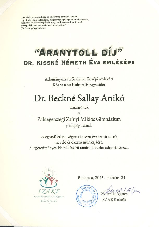(Felkészítő tanáruk: Dr. Bóbics Lilla)