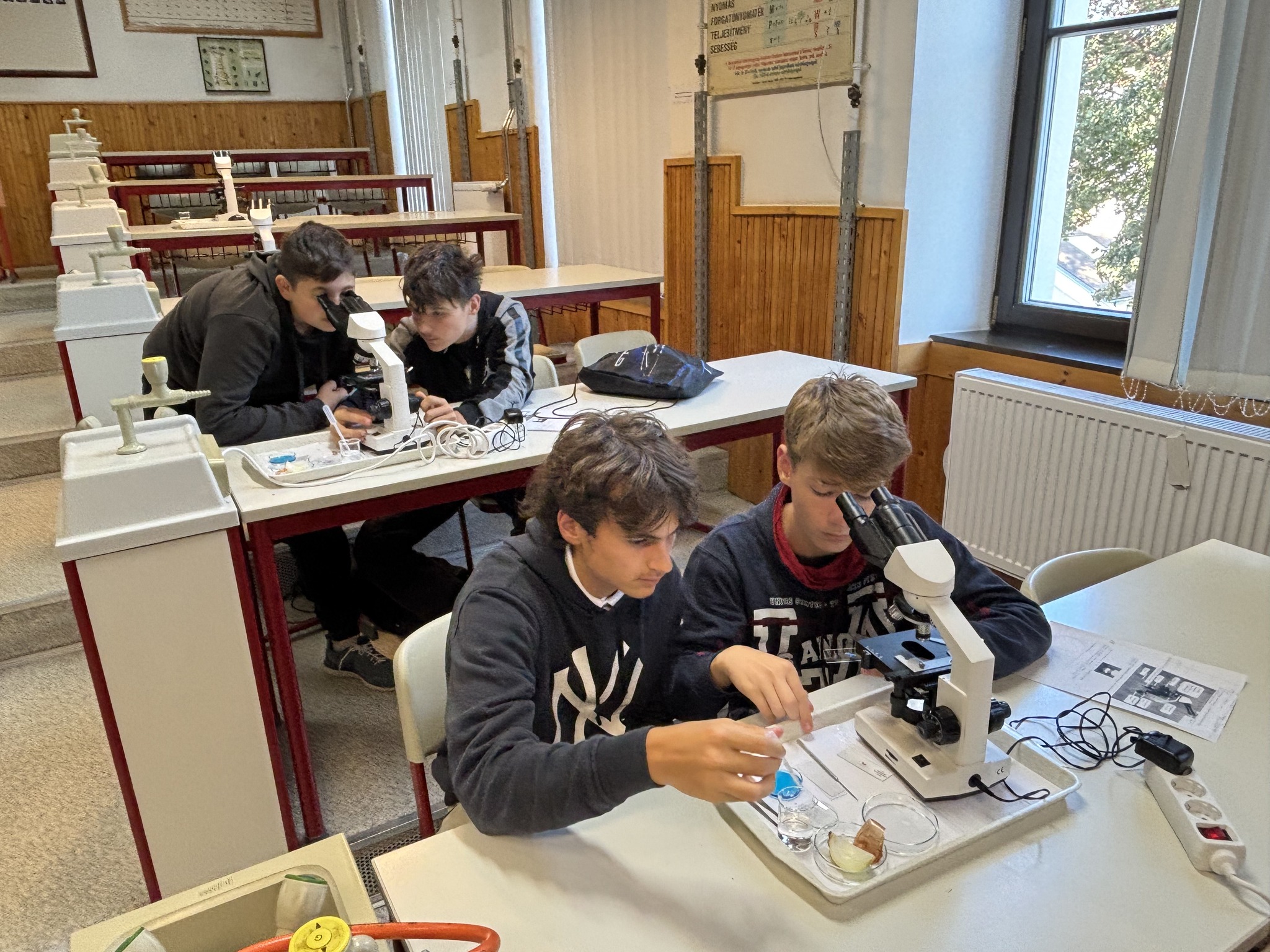 Szőke Károly tanár úr vezetésével a tanulók fénymikroszkópokkal
