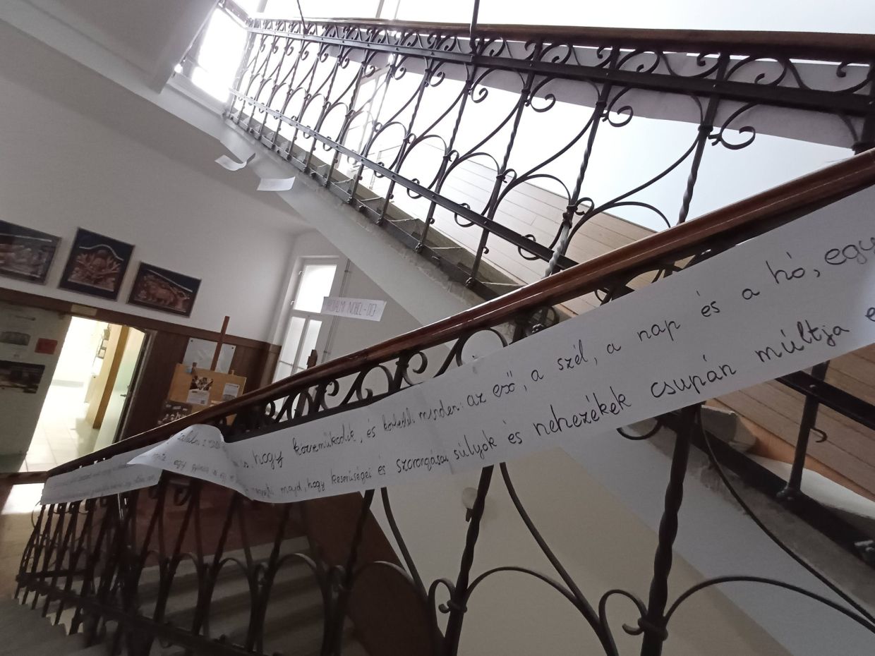 Az ünnep az iskola közösségi tereiben is jelen volt. Dienes Gyula és tanítványai különleges installációval készültek: Krasznahorkai László monumentális mondatai díszítették a lépcsőkorlátokat, vizuálisan is megidézve az irodalmi hömpölygést. Emellett a mai napon minden magyarórát a stockholmi beszéd felolvasása tett még ünnepélyesebbé, a szerző irodalmi Nobel-díja apropóján.